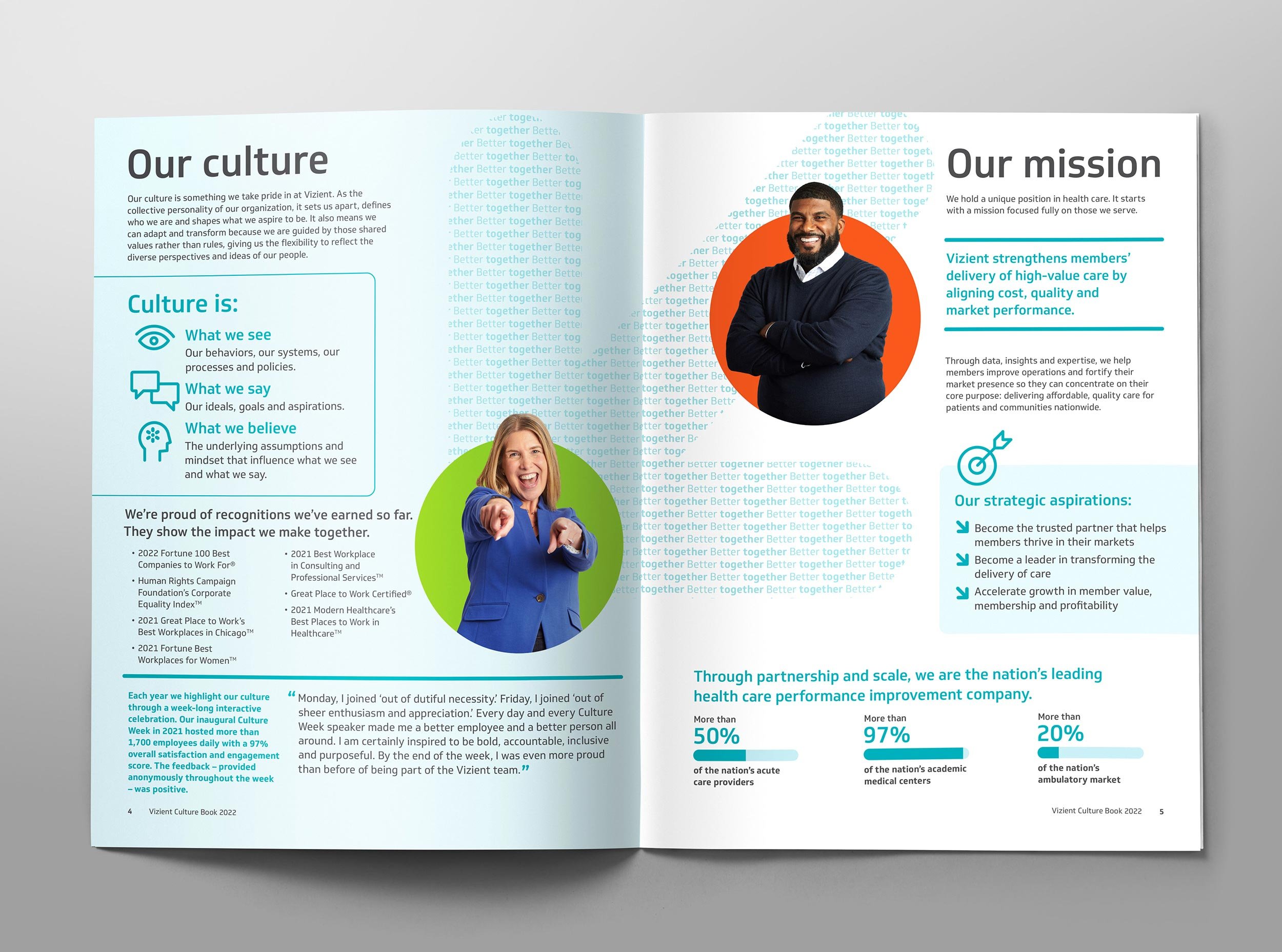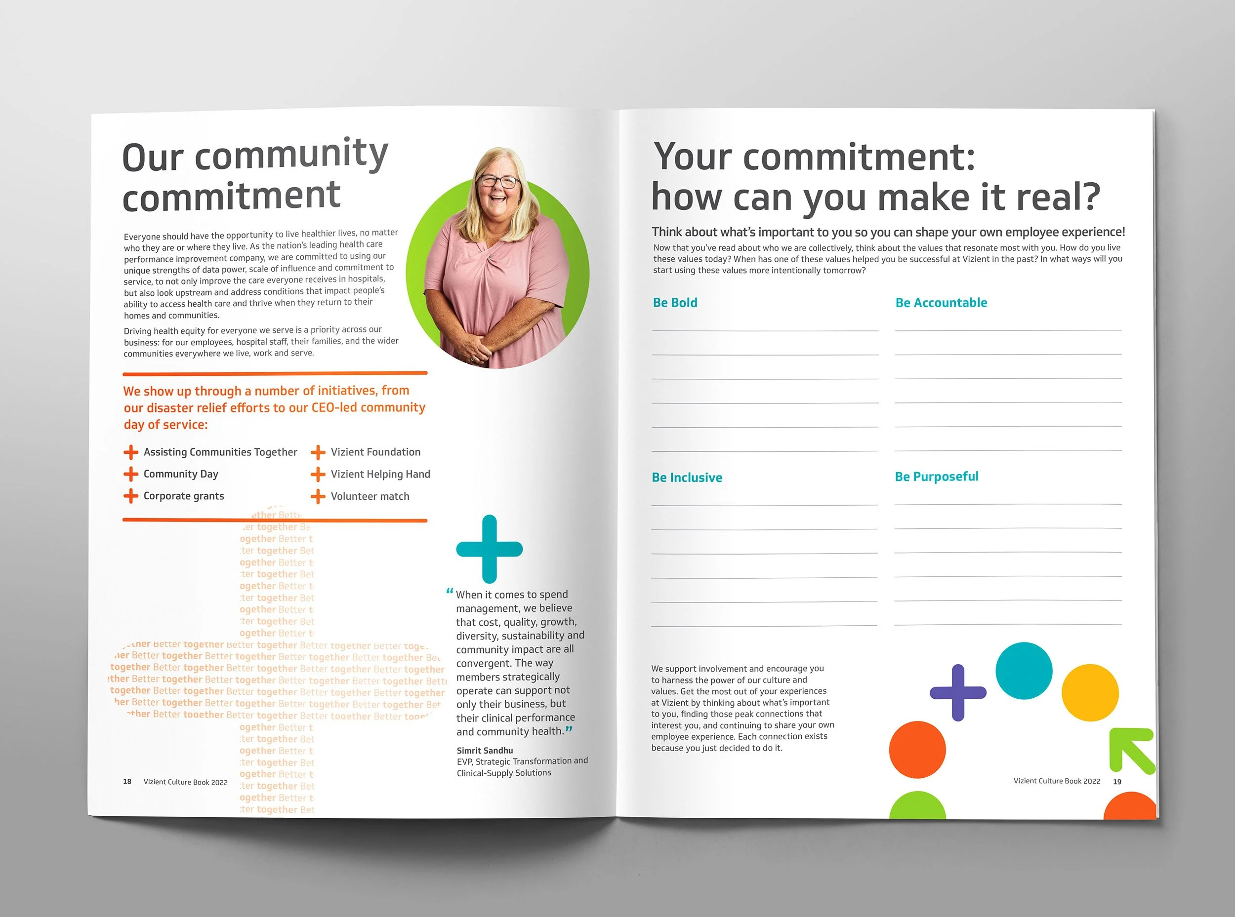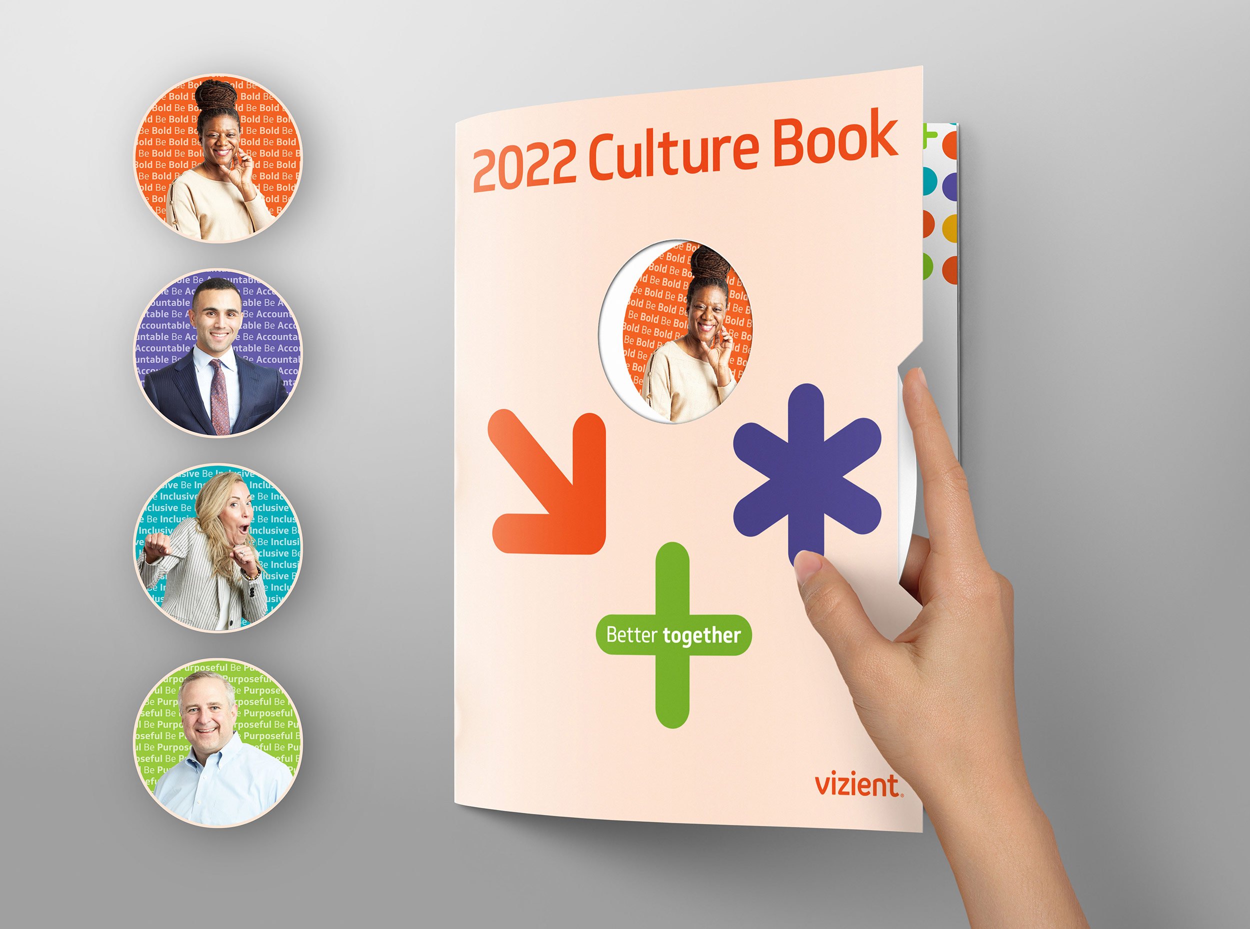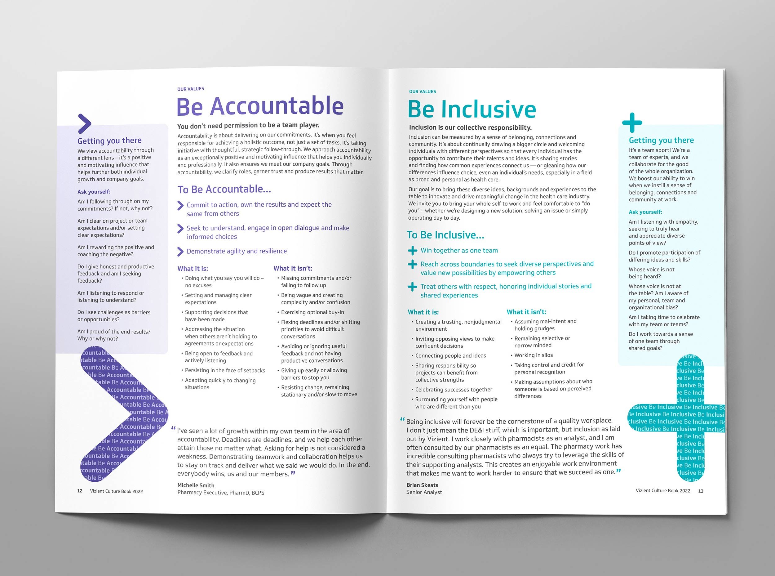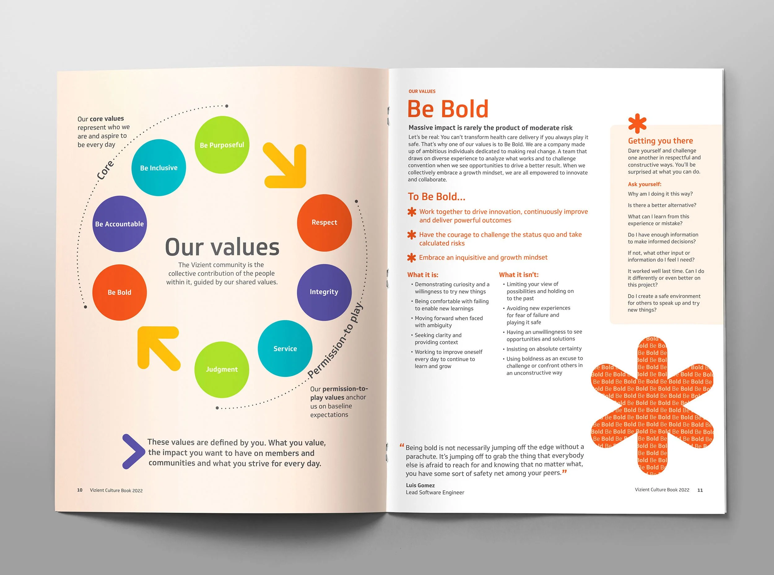 To showcase their core employee values, Vizient published a glossy handbook for its 4,000+ associates. “Be Bold, Be Accountable, Be Inclusive and Be Purposeful” was the mantra. The net result? Folks felt even prouder to go to work. This book was an engaging guide that boosted morale and productivity.