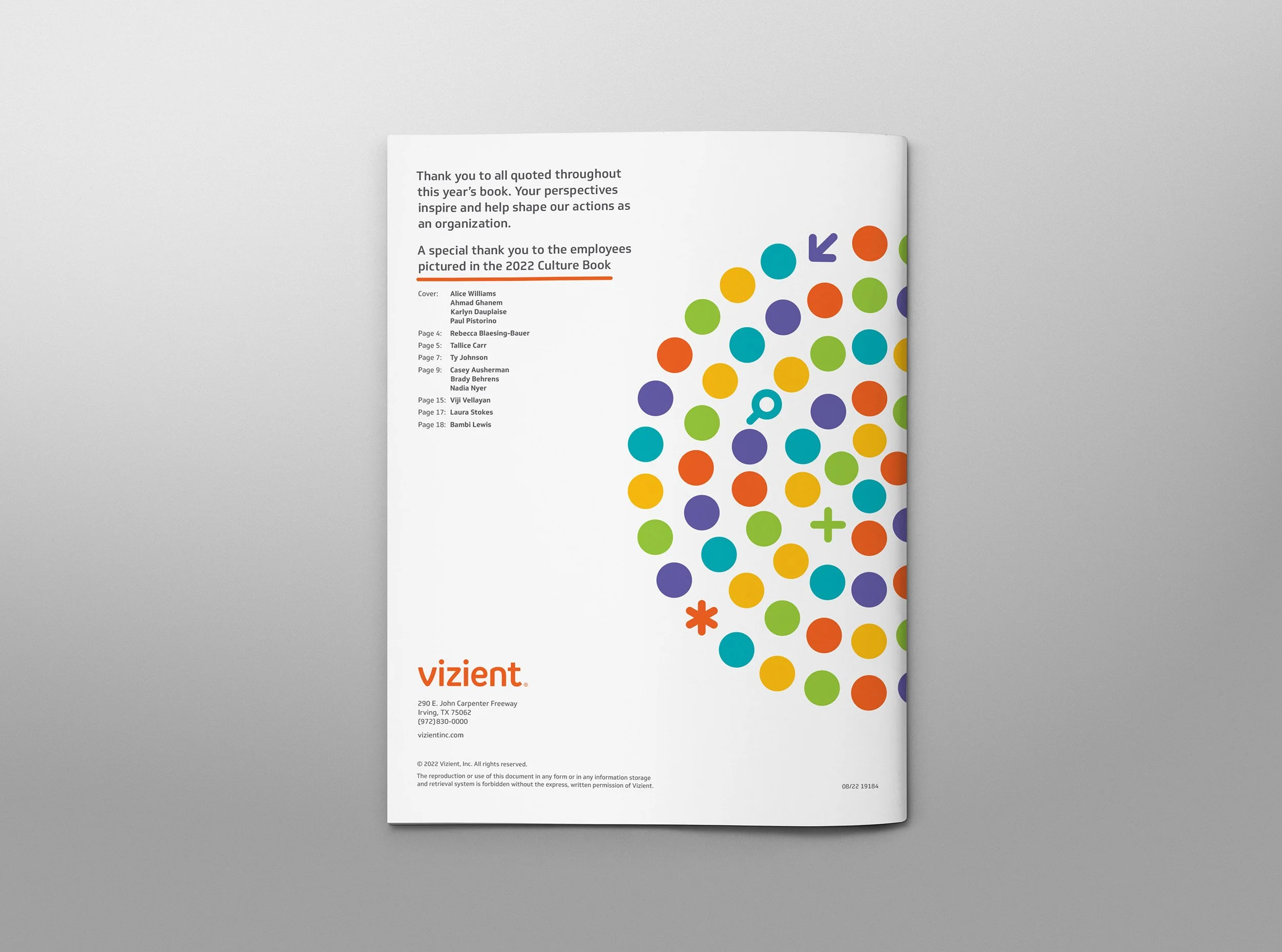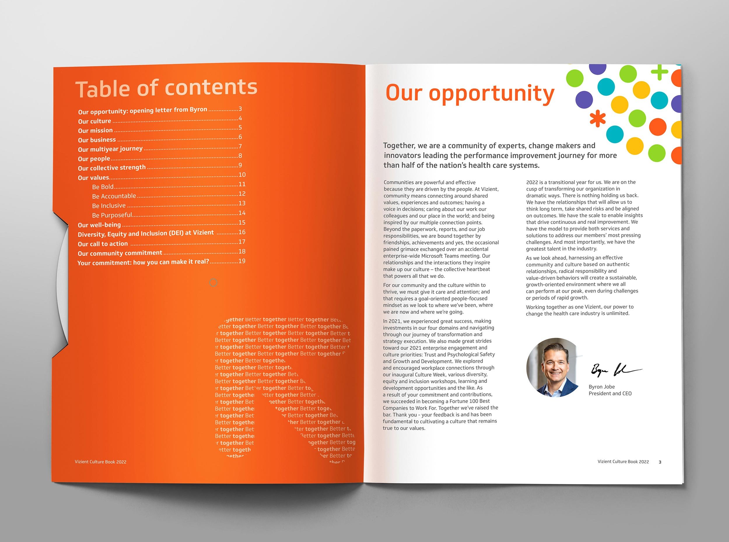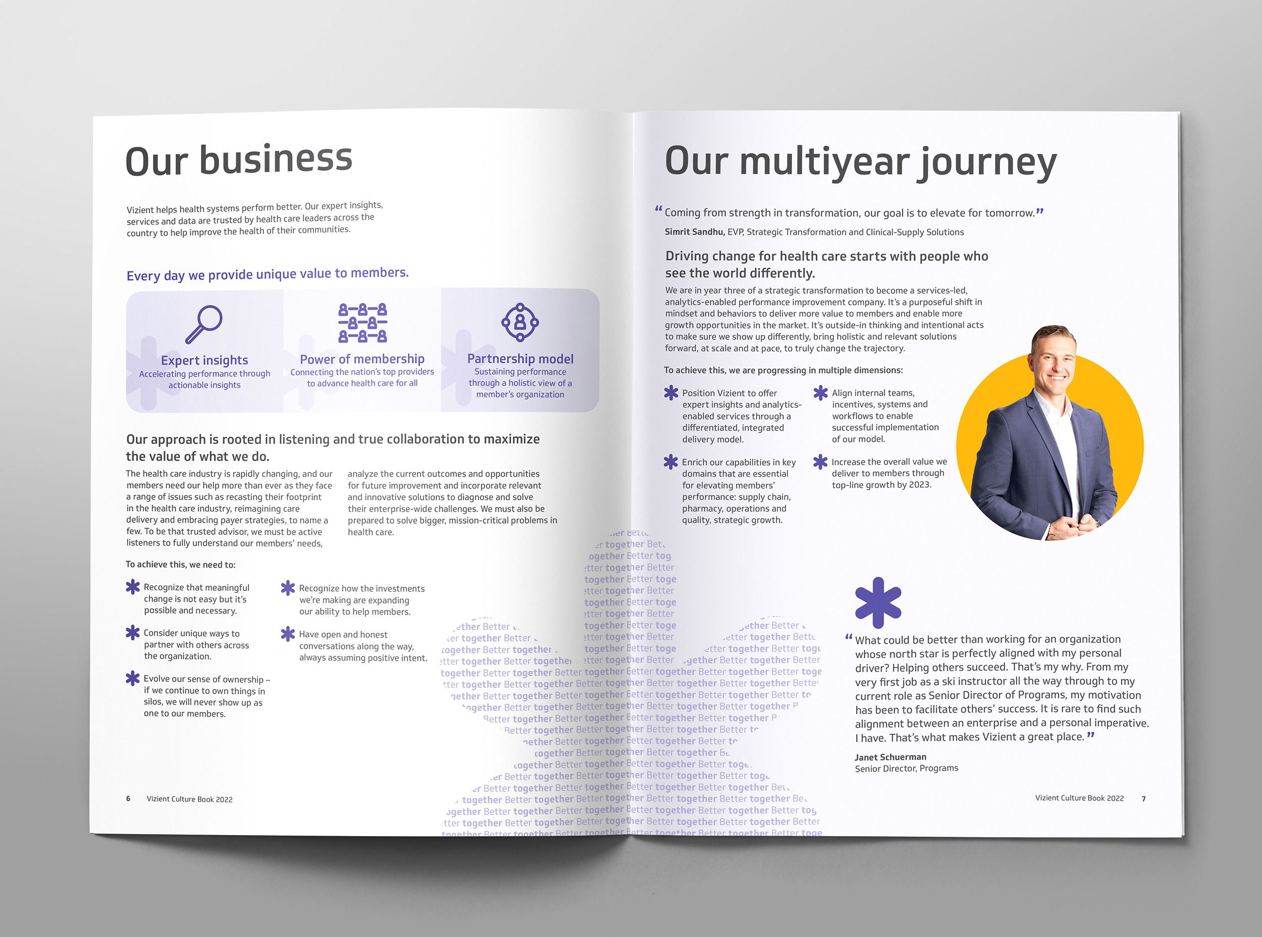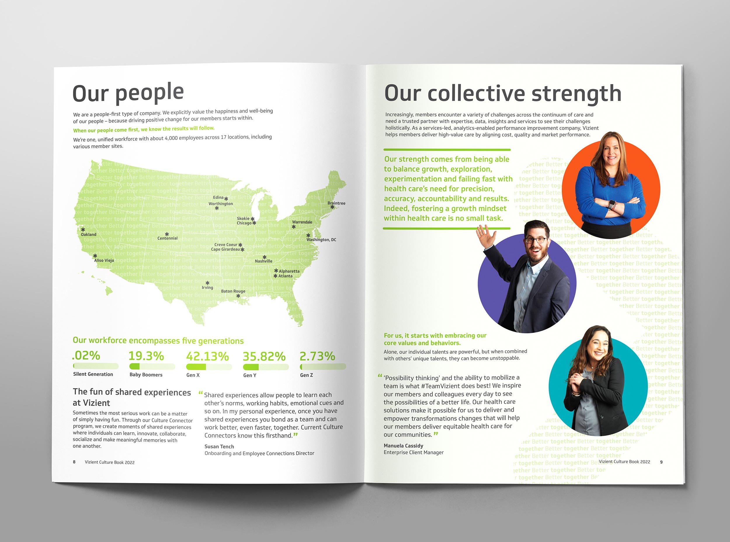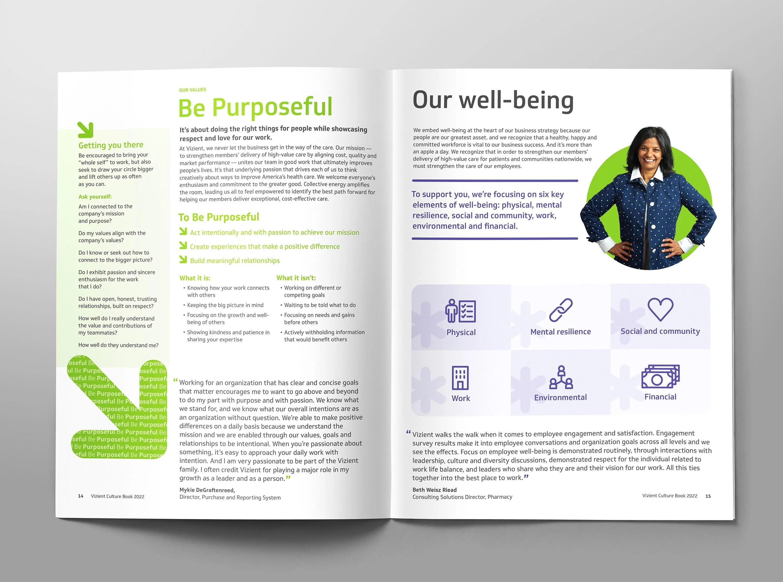 To showcase their core employee values, Vizient published a glossy handbook for its 4,000+ associates. “Be Bold, Be Accountable, Be Inclusive and Be Purposeful” was the mantra. The net result? Folks felt even prouder to go to work. This book was an engaging guide that boosted morale and productivity.